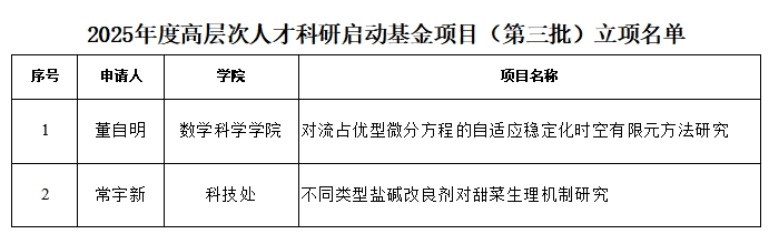根据教师工作部(人事处、人才工作办公室)有关通知,按照《包头师范学院高层次人才引进管理办法(修订)》(包师院办发〔2018〕33号)及《包头师范学院高层次人才引进及管理办法(2022 年版)》(包师党办发〔2022〕10号)文件规定,学校开展2025年度高层次人才科研启动基金项目(第三批)申请立项工作。经评审,本次批准立项2025年高层次人才科研启动基金项目2项,名单见附件。