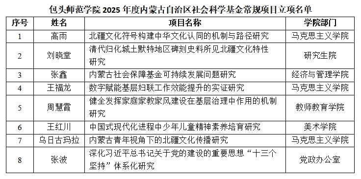 本年度马克思主义学院高雨老师的《北疆文化符号构建中华文化认同的机制与路径研究》、王福龙老师的《数字赋能基层妇联工作效能提升的实证研究》以及乌日古玛拉老师的《内蒙古青年视角下的北疆文化传播研究》成功立项。同时,研究生院刘晓堂老师的《清代归化城土默特地区碑刻史料所见北疆文化特性研究》、经济管理学院张鑫老师的《内蒙古社会保障基金可持续发展问题研究》、教师教育学院周慧霞老师的《健全发挥家庭家教家风建设在基层治理中作用的机制研究》、美术学院王红川老师的《中国式现代化进程中少年儿童精神素养培育研究》和党政办公室张波老师的《深化习近平总书记关于党的建设的重要思想“十三个坚持”体系化研究》也均获批立项。立项项目紧密结合时代主题、地方特色,有较高的学术价值和现实指导意义。
