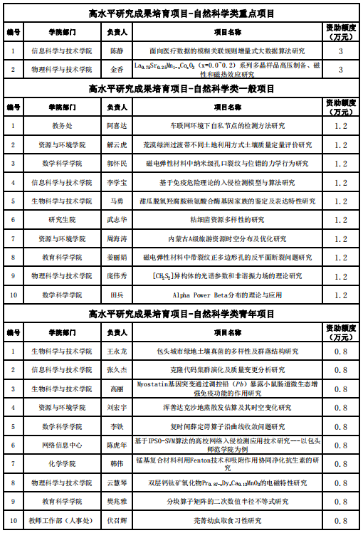学校组织相关专家对2021年度包头师范学院科研项目进行认真评审、评议,本着公开、公平、公正的原则,拟对52位教师的项目批准立项。服务地方发展项目12项:重点项目1项,资助额度3万元;一般项目11项,每项资助1.2万元。高水平研究成果培育项目人文社科类18项:一般项目10项,每项资助0.8万元;青年项目8项,每项资助0.5万元。高水平研究成果培育项目自然科学类22项:重点项目2项,每项资助3万元;一般项目10项,每项资助1.2万元;青年项目10项,每项资助0.8万元。具体名单见附件。