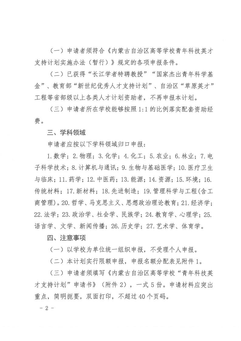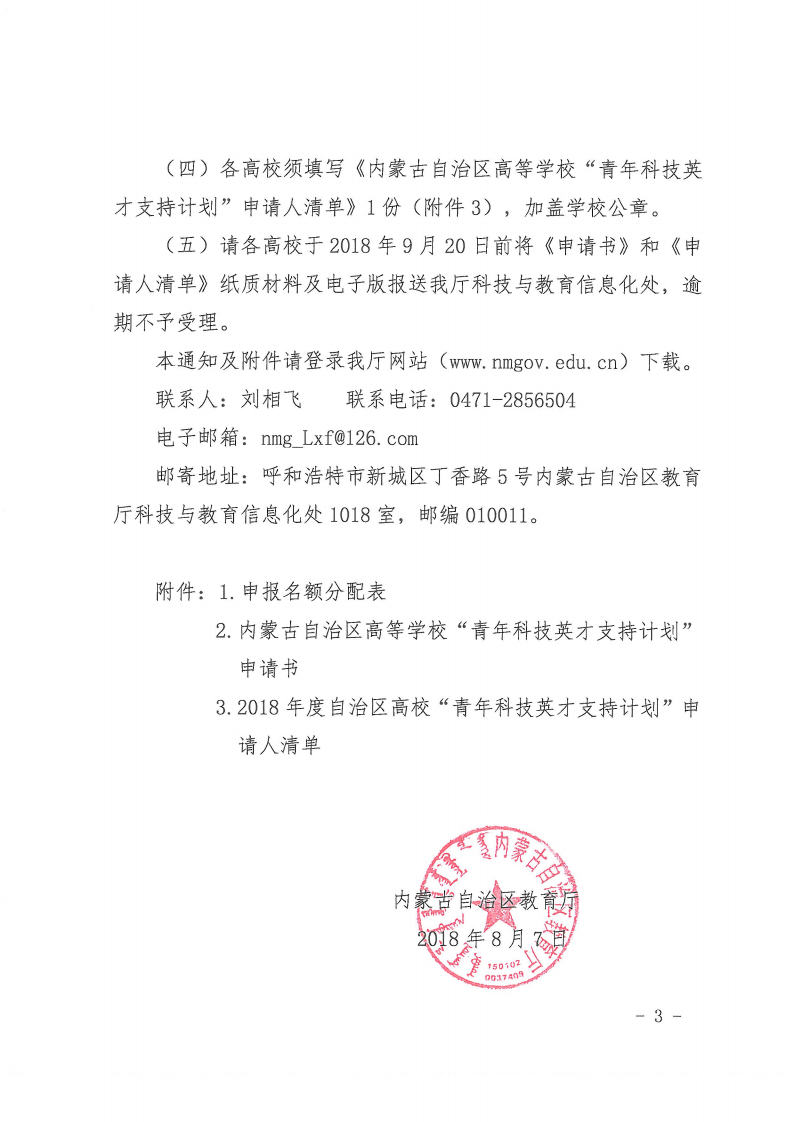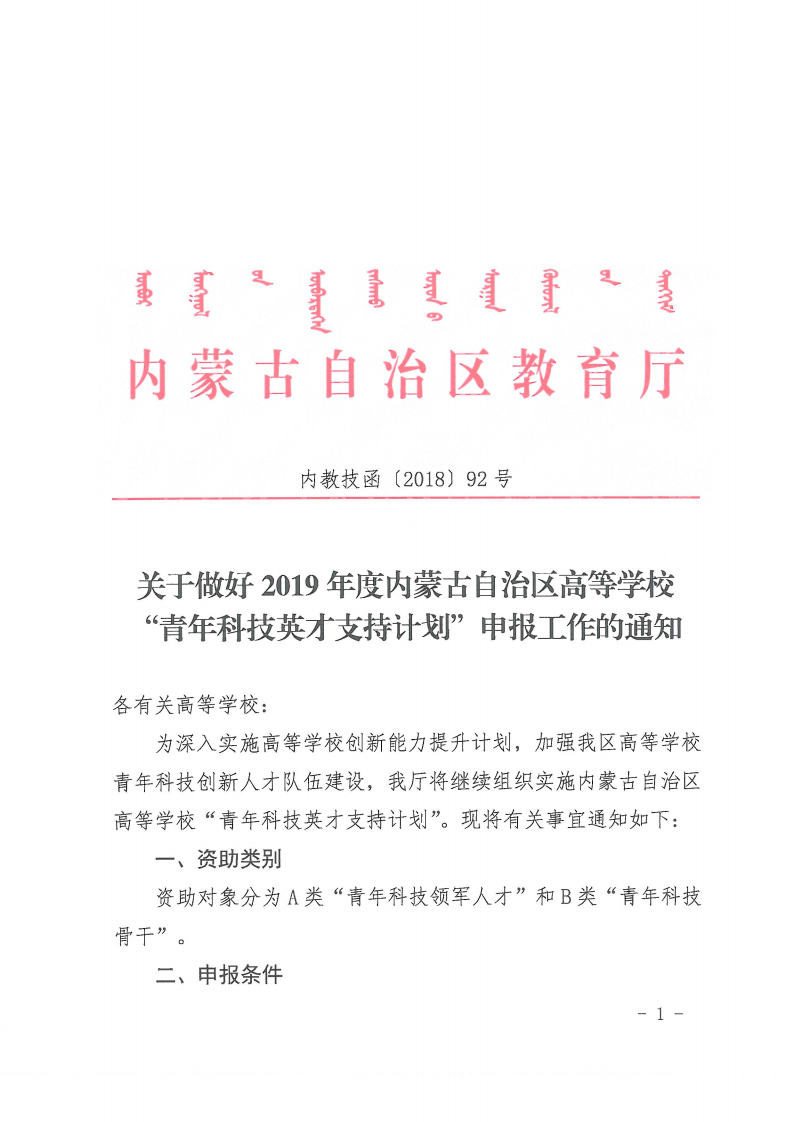 2019年度自治区高等学校“青年科技英才支持计划”申报工作已开始,现将《关于做好2019年度自治区高等学校“青年科技英才支持计划”申报工作的通知》(见附件)转发给你们,请各学院认真组织申报工作,并请于2018年9月12日上午11:30前将《申请书》和《申请人清单》纸质材料及电子版统一报到科技处(410室),逾期和不符合条件的申请材料不予受理。