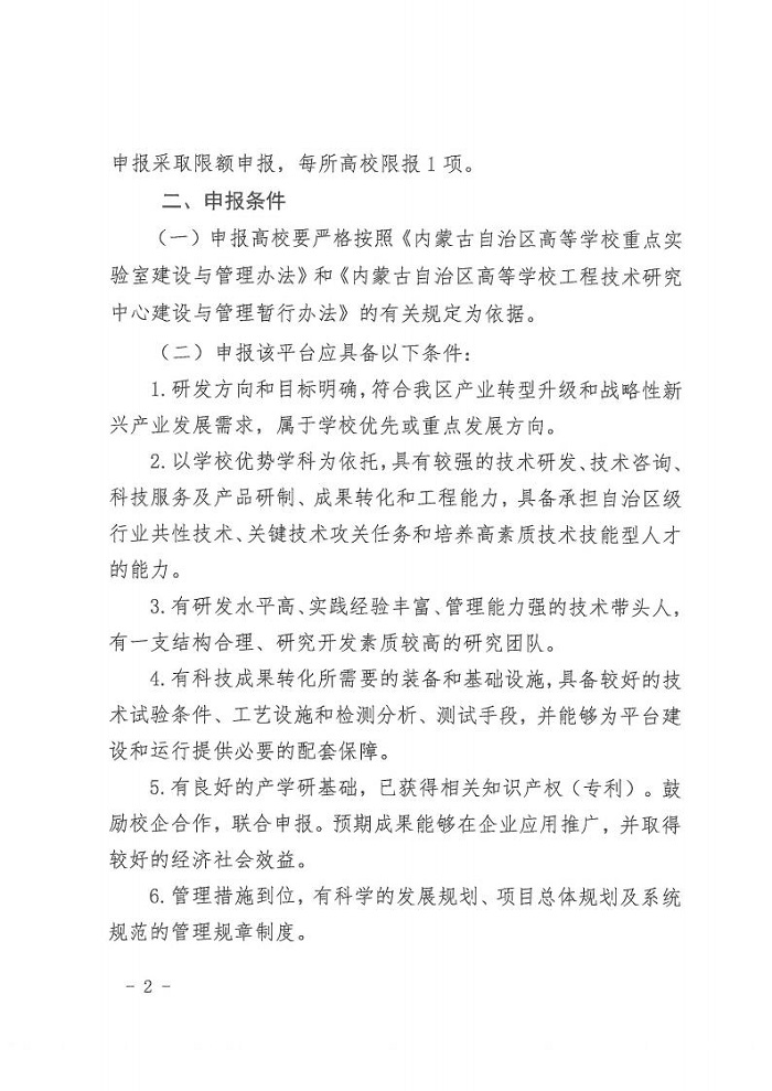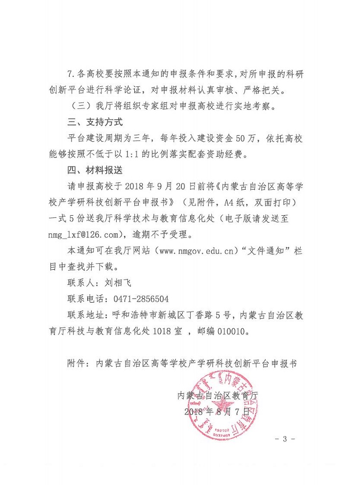 2019年度自治区高等学校“产学研科技创新平台”申报工作已开始,现将《组织申报2019年度内蒙古自治区高等学校产学研科技创新平台的通知》(见附件)转发给你们,请各学院认真组织申报工作,并于2018年9月12日上午11:30前将《申请书》纸质材料及电子版统一报到科技处(410室),逾期和不符合条件的申请材料不予受理。