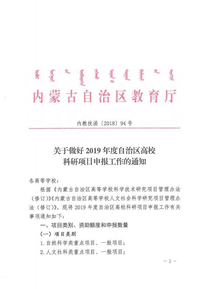 2019年度内蒙古自治区高等学校科学技术研究项目申报工作已开始,现将《关于做好2019年度内蒙古自治区高等学校科学技术研究项目申报工作的通知》(见附件)转发给你们,请各学院认真组织申报工作。